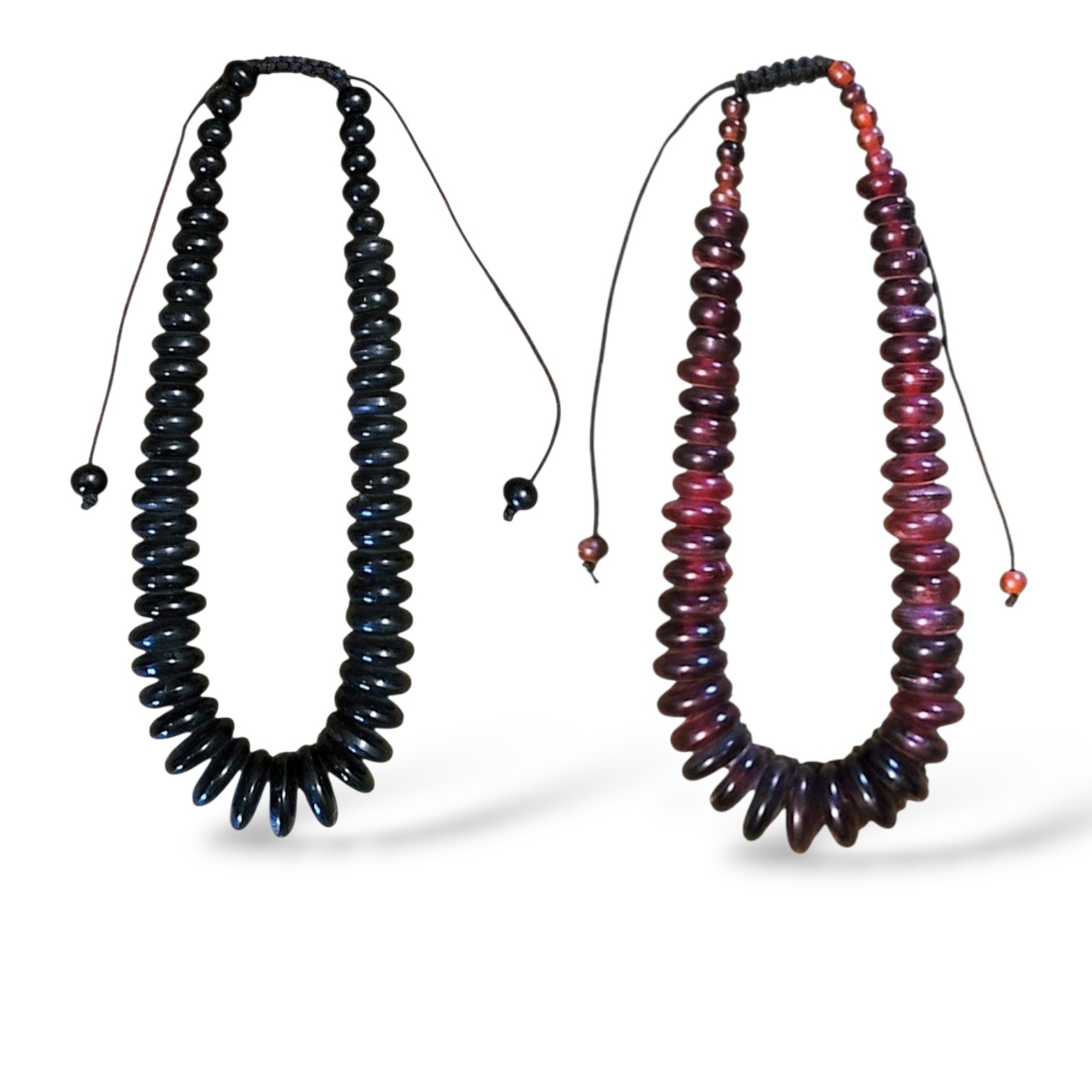 This graduated Horn heishi necklace varies in length from 21″ to 31″ by using the nylon chord. Color choices are Wine or Black.  Super easy to adjust and great for layering! The heishis measures .5″ to 1″.