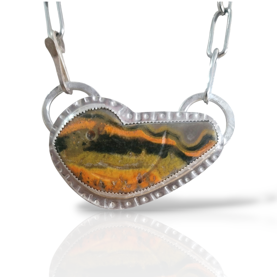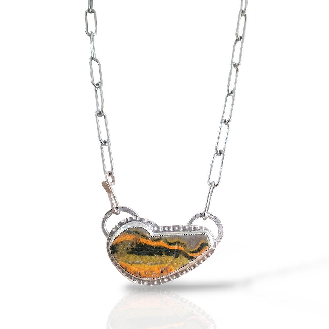 This Bumble Bee Jasper stone is next to a dime to show scale. This stone has bright golden yellow, black and greenish veining. This stone can be purchased alone, or made into a pendant ( see the example below)or bolo tie.
