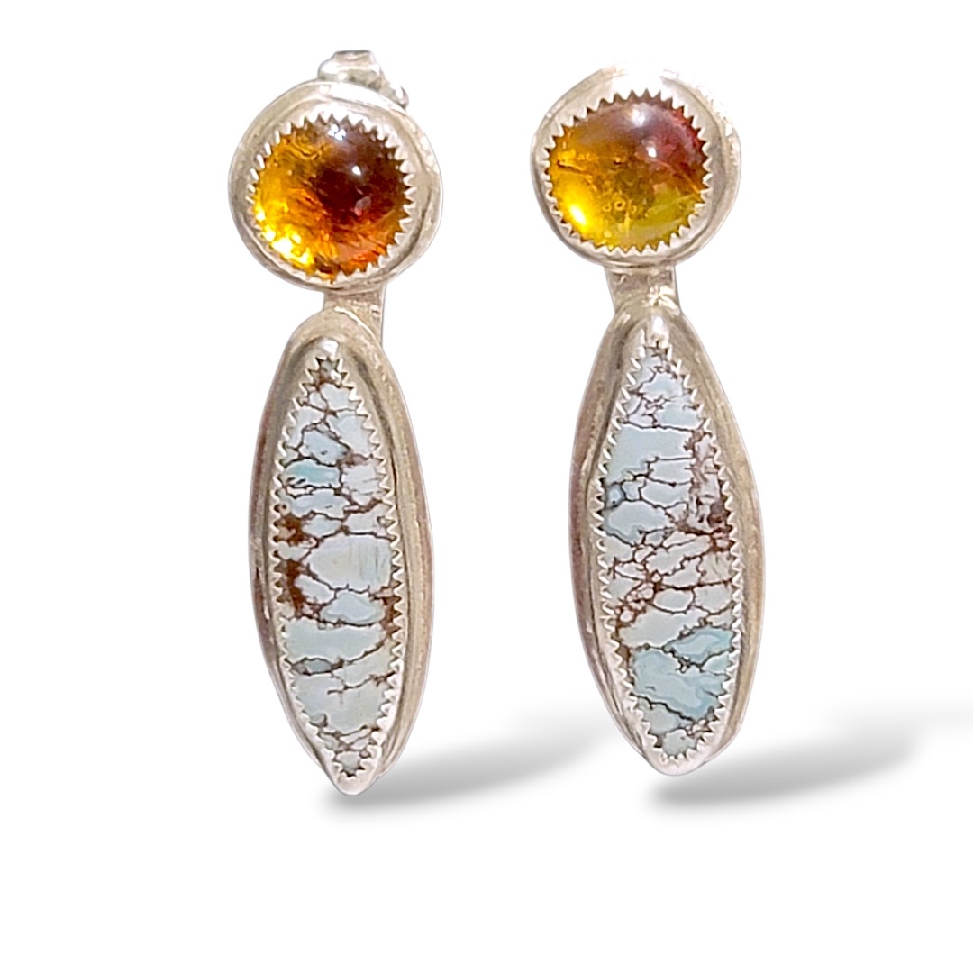 These artisan earrings are made with Amber rounds and Gobi turquoise oblong cabochons. The stones are set in silver on silver back plates with silver posts. These earrings have a drop of 1.75″.