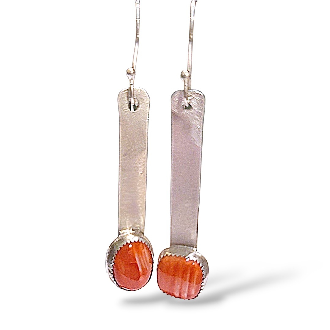These asymmetrical Spiny Oyster earrings are set in silver, on silver back plates, on silver panels. These earrings have 2.5″ drop