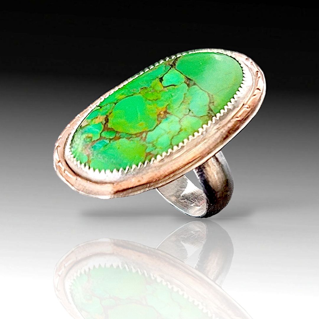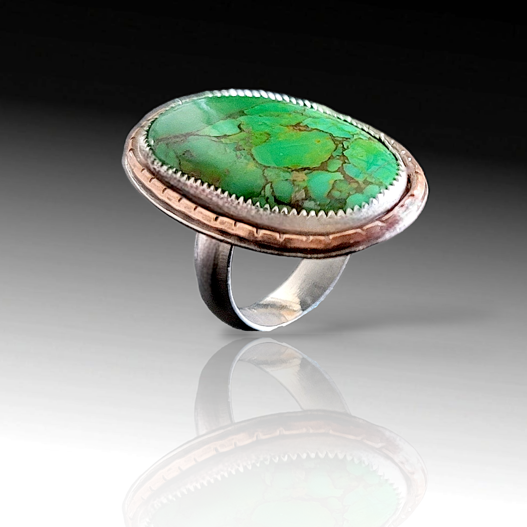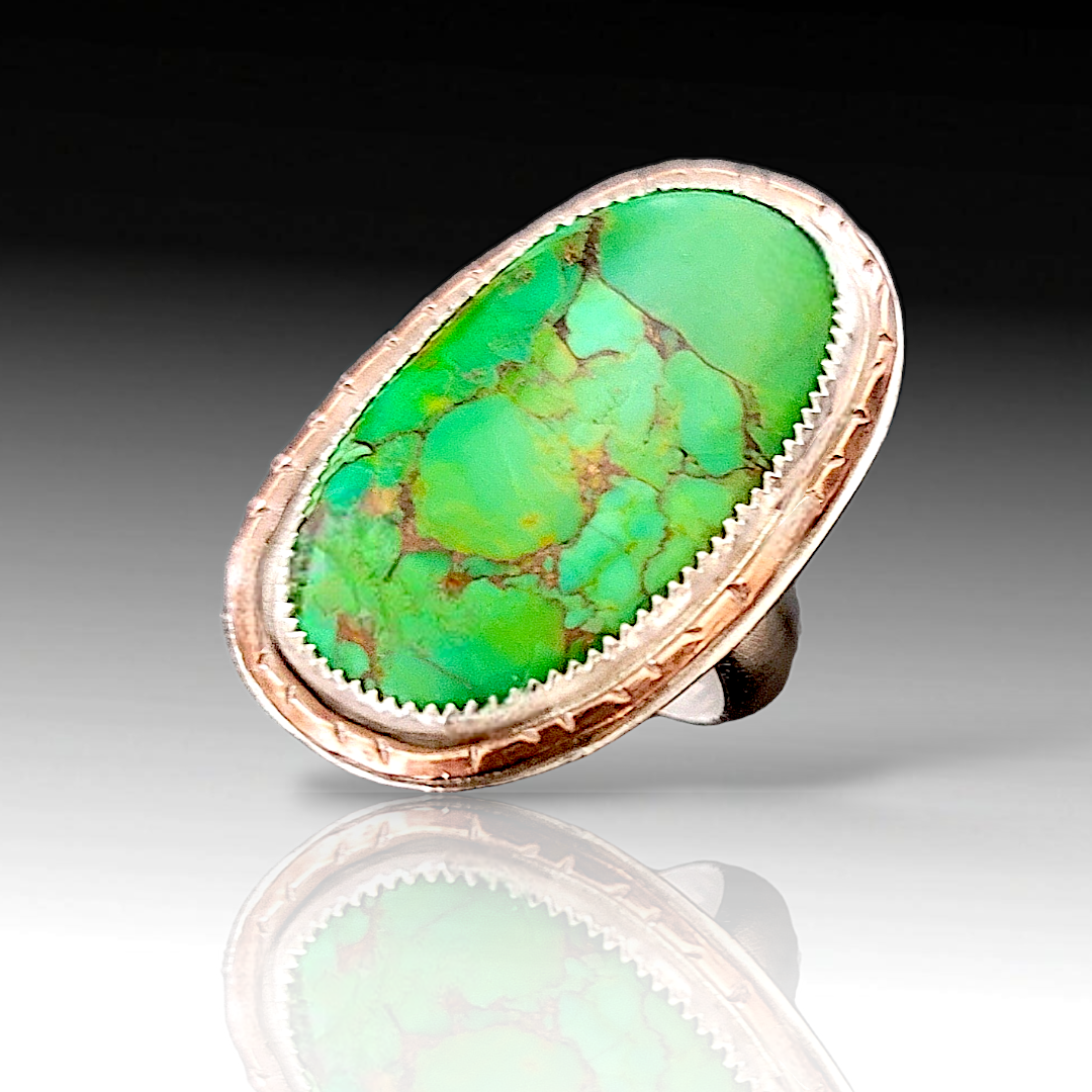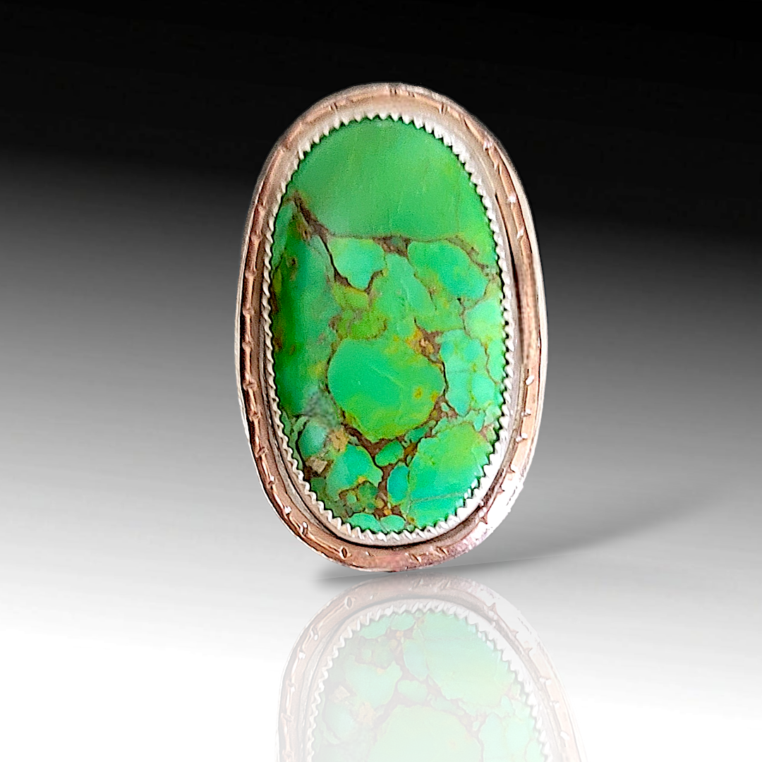 This Mojave turquoise is set in a silver bezel, copper accent trim, on a silver back plate with a 4 gauge low dome silver band. The stone in its setting measures 1.5″ x 1″. This ring is a size 8.5. The stone has shades of vibrant greens with native copper inclusions.