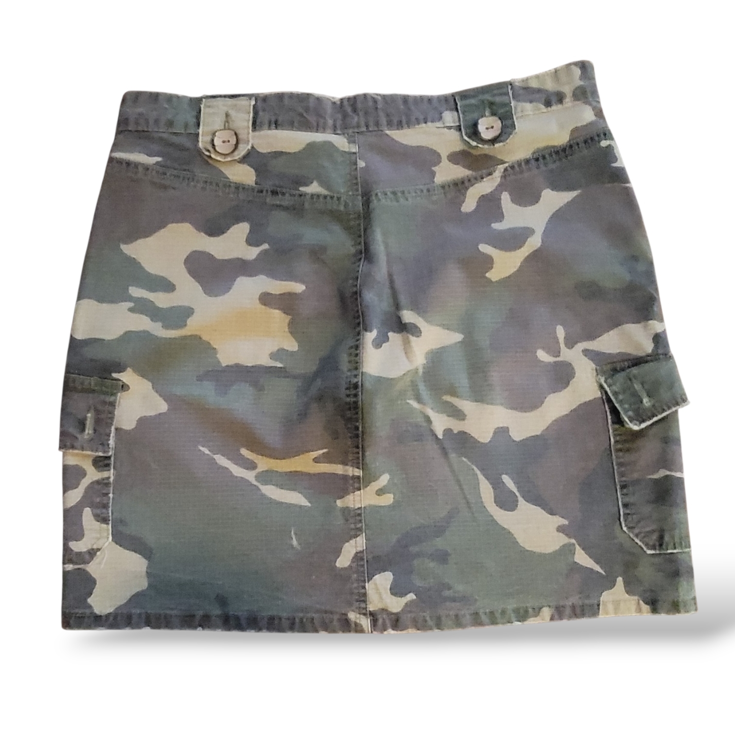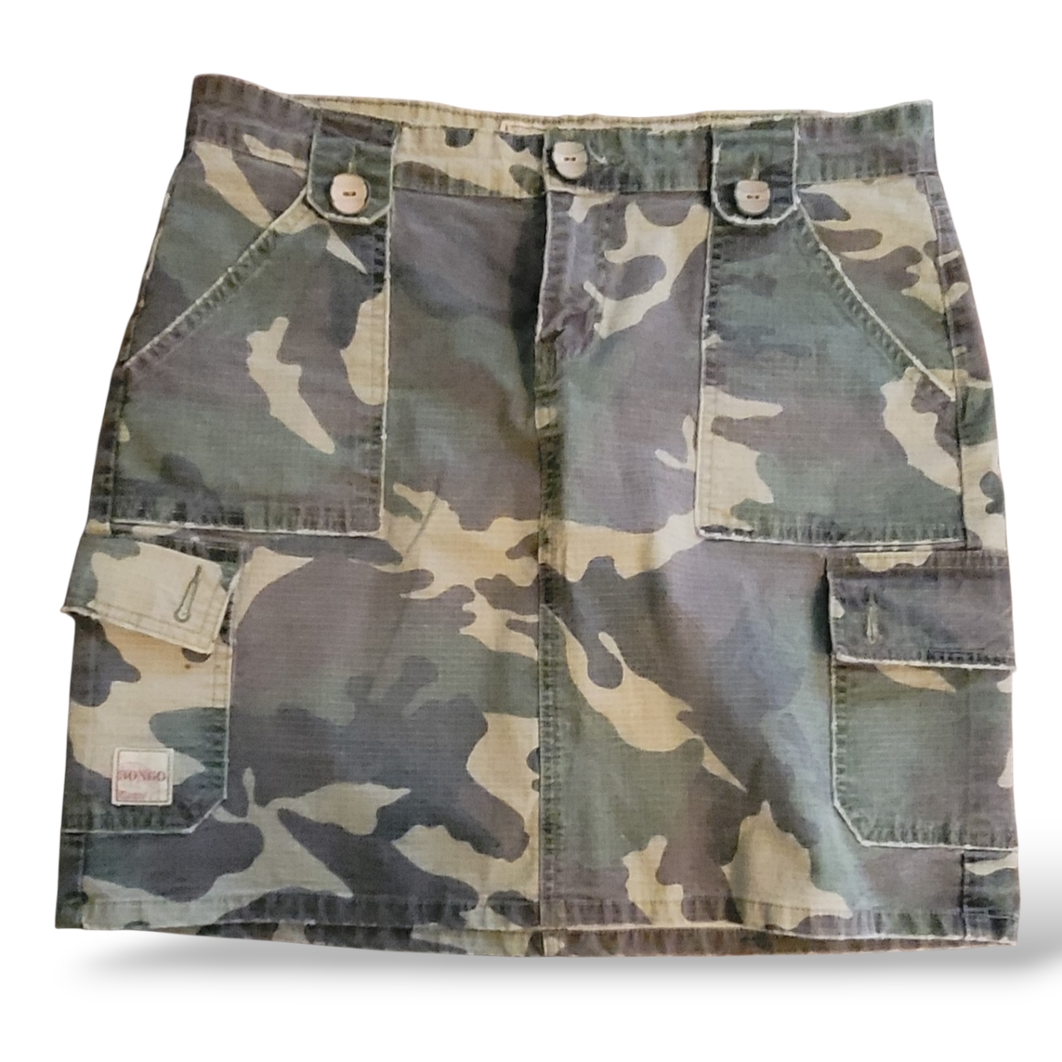 BONGO camo skirt with 2 front pockets and 2 side cargo pockets. Wood buttons. Size 9